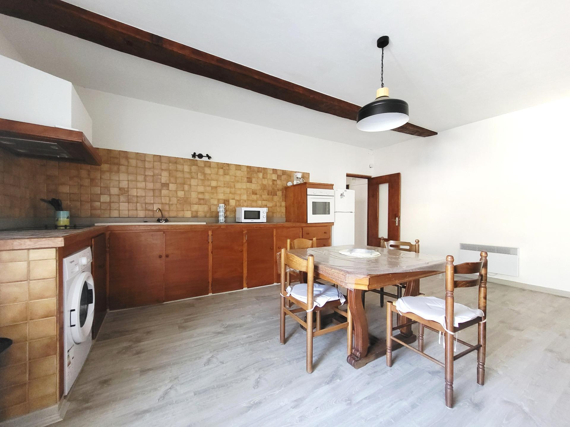 -Une cuisine entièrement équipée (réfrigérateur, congélateur, plaques de cuisson, four, rangements) donnant sur une salle à manger spacieuse.